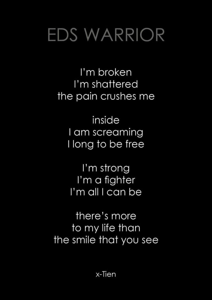 Ik heb het al vaker geschreven, onze aandoening verdient ook aandacht. Zolang de artsen mensen naar een fysio blijven sturen om vooral maar hard te trainen, zolang mensen naar huis gestuurd worden met de boodschap ‘stel je niet zo aan, iedereen heeft weleens pijn’ klopt er iets niet. Ik las gisteren nog een verhaal van een HSD (Hypermobility Spectrum Disorders) lotgenootje; geen vergoeding voor fysiotherapie omdat de arts niet geloofd dat dit een serieus probleem is. HSD heeft precies dezelfde behandeling nodig, als EDS, maar wordt nog steeds niet serieus genomen.