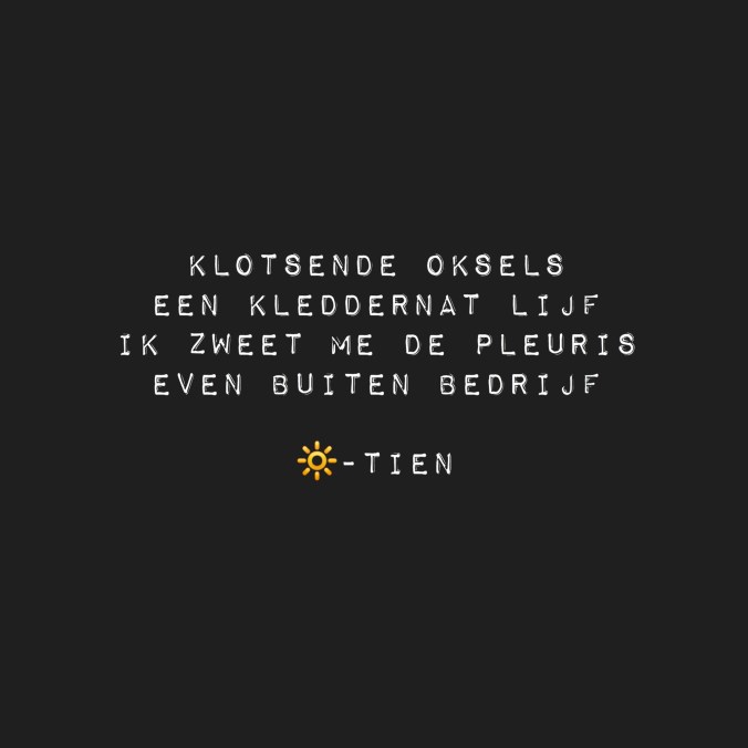 Mijn lijf doet het beter bij warmte, mijn opvliegers ook zo blijkt. Onderstaand gedichtje zegt eigenlijk alles 😉. Toch klaag ik niet, na maanden achter de geraniums ben ik blij buiten te kunnen liggen. Al vind ik 25 graden warm zat 😉, toch een echte Hollander, altijd wat te zeiken hihi.