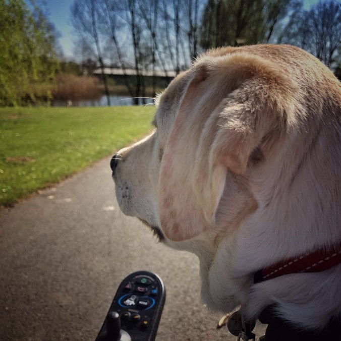 Lewis kijkt met grote ogen om zich heen, wil in het park wel een stukje lopen, dus ik help hem voorzichtig van mijn schoot af. Hij snuffelt en loopt verder netjes naast me, onze constructie werkt perfect. Na een meter of honderd is hij het weer zat. Hij heeft veel geroken, veel gezien. Hij heeft de ganzen gehoord, opvliegende eenden en meerkoeten, schreeuwende kinderen (jawel, ze bevolken nog steeds de speeltuinen), veel indrukken dus. Zijn poten vinden de weg naar mijn voetplaat, zijn bips ook. Hij zit wiebelend op mijn voeten en kijkt mij aan met een blik van ‘komt er nog wat van’. Ik help hem weer omhoog en we rijden samen naar mijn ouders. Even gedag zeggen in de tuin, op afstand, ik ben dankbaar dat we dit kunnen doen.