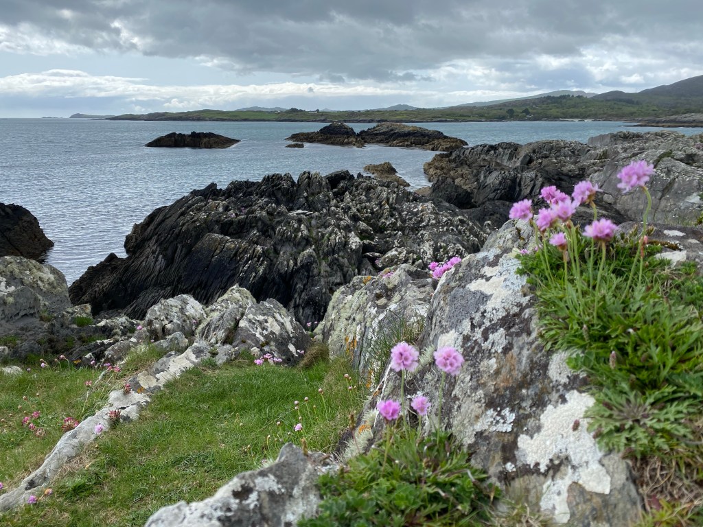Ok, we zitten weer in de auto. Ik heb mij bergop laten duwen. We stoppen bij een werkelijk droomplaatje, roze bloemetjes tussen zwarte rotsen, daar krijgt de fotografe in mij het serieus warm van. En daar loop ik dus ook warm voor, ik grijp mijn camera en huppel als een kreupele berggeit richting rotspartij. Ik kies er bewust voor dit te doen en zou feitelijk trots op mezelf moeten zijn. Ik geef én mijn grenzen aan én gun het mezelf mijn inzetbare mogelijkheden nu te gebruiken. Ik ben ook trots, maar tegelijk roert zich de innerlijke criticus. Dat stemmetje dat roept, ‘en dat kun je wel?’ Ik veroordeel mezelf alvast voor een ander. Zie mezelf door hun ogen en denk te weten wat zij denken (en niet zeggen). Niemand zegt iets hoor, dit speelt zich af in mijn eigen hoofd. Ik ben liefdevol naar anderen, gun ze alles en tegelijk maak ik mezelf met de grond gelijk. Er is nog wat werk aan de winkel blijkbaar.