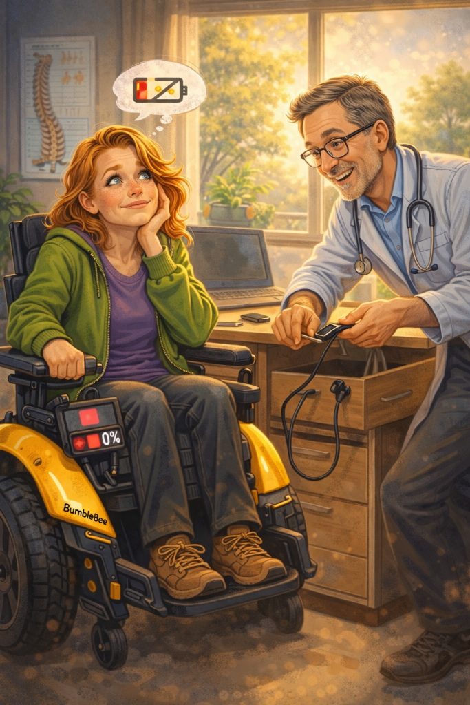 Ik ging naar dok dus, met een batterij op het laatste gele streepje. Moest kunnen, was mijn inschatting. Niet dus. In de wachtkamer schoot hij naar rood en in de spreekkamer wilde ook BumbleBee graag wat aandacht. Een foutmelding, een alarm en hoppakee, klaar ermee. Gelukkig is mijn dok van alle markten thuis en toverde hij een oplaadkabel tevoorschijn. We rondden mijn issues af (ook de schouder schreeuwde om aandacht) en ik vertrok naar de wachtkamer. BumbleBee achterlatend aan het bureau van dok. Die er gelukkig de humor wel van in kon zien.