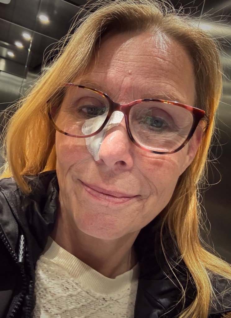 In het gezicht doen ze tegenwoordig MOHS-chirurgie. Dat betekent dat de wond open blijft totdat ze de uitslag hebben. Als er nog meer weggehaald moet worden, roepen ze je terug. Ik had geluk: ze hadden alles in één keer te pakken en na anderhalf uur mocht ik weer naar huis.