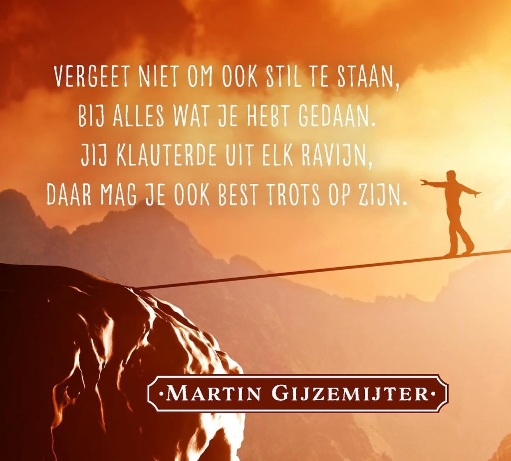 Ik ga mijn rust vinden ín de rust. Ik breek uit mijn hokje en zal overwinnen. Ooit is dit heden een verleden, en loop ik gezond en wel, in het nu.