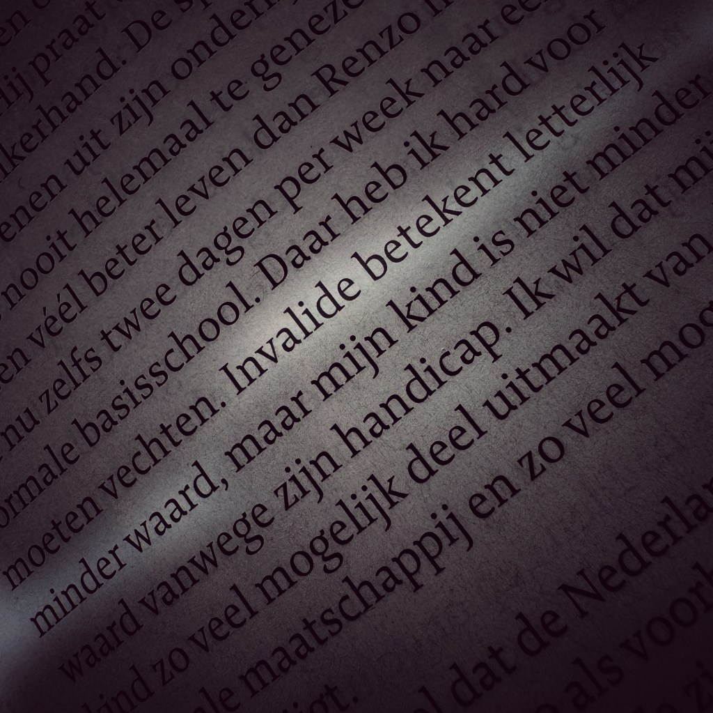 Ik ben dus zo’n arbeidsbeperkt persoon. Nou ja, ik werk helemaal niet meer, ik ben gewoon een honderd procent Kneus. Arbeidsongeschikt. (Die laatste is weer een punt.) Arbeidsbeperkten zijn kwetsbaar, heb ik niet bedacht, dat lees ik net. Het klopt trouwens wel, want met het verlies van vermogen tot werken verlies je nog veel meer. Je komt niet langer in aanmerking voor een promotie. Ja, tot blijvend arbeidsongeschikt, maar that’s it, geen verdere perspectieven. Als jong gehandicapte betekent dit een leven lang op een minimum loon, minder nog, ik las dat ook dat iets is waarvoor gevochten moet gaan worden. Arbeidsgehandicapten verdienen minder dat het minimumloon. Iets dat er bij mij sowieso niet zo goed ingaat. In onze kapitalistische maatschappij is presteren, omzet draaien het enige dat telt. Alles en iedereen is verworden tot een getalletje. Een getalletje dat meer getallen moet opleveren. Met een euroteken ervoor het liefst.