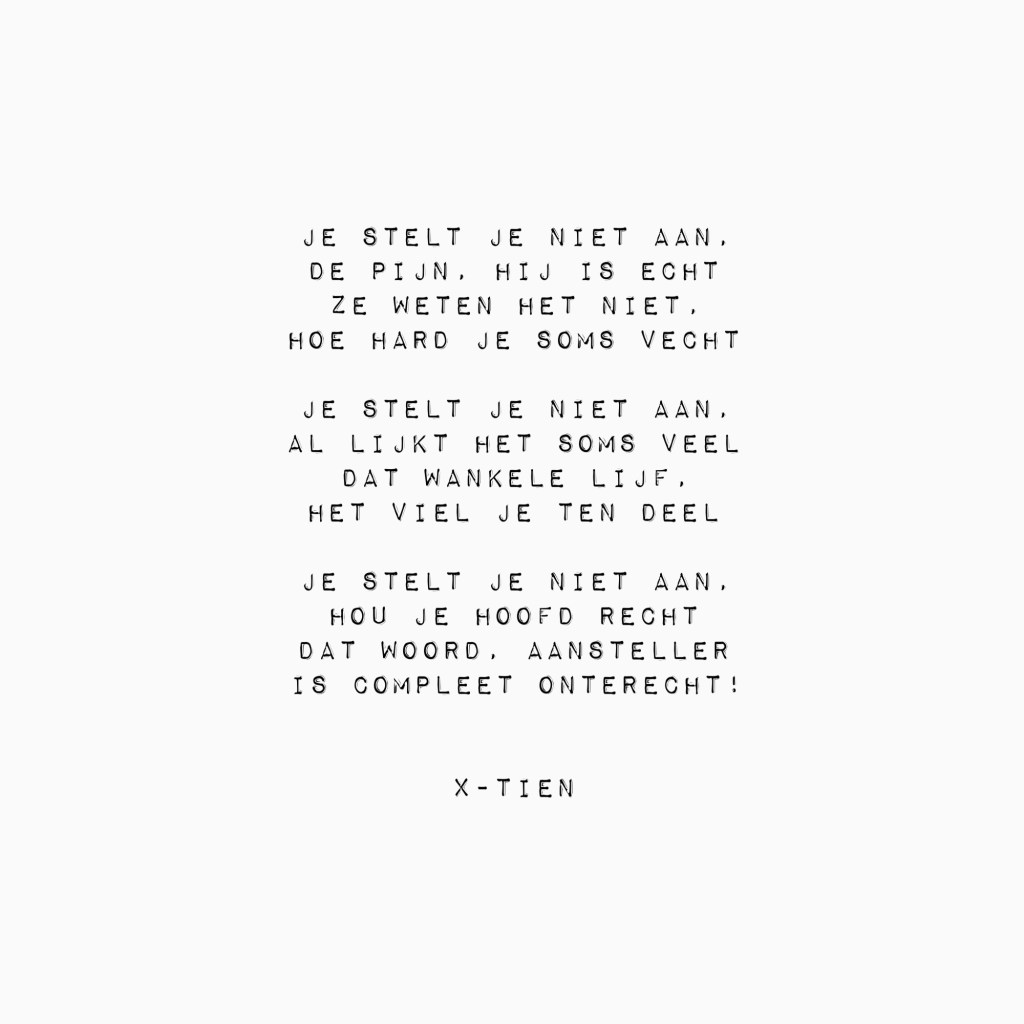 En ook díe blikken lieten sporen na. Ik voel ze nog, maar laat ze achter me, bij en met het schrijven van dit stukje. Want ik mag het achter me laten. Ik bén geen aansteller, ik ben eerder het tegenovergestelde. En als je me dan een keer hoort zeggen dat iets in mijn lijf pijn doet, denk dan maar aan al die onderdelen die ik niet noem, want geloof mij, daar zijn er nog steeds veel meer van. En dat zeg ik niet om medelijden te krijgen, want dat hoef ik niet. Maar het is wel de realiteit.